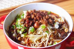 用料: 碱水面300克,芽菜50克,小葱2根,蒜4瓣,辣椒油1勺,芝麻酱1勺,油酥黄豆50克,味精1勺,猪肉馅100克,姜1/2块,黄豆酱油2勺,花椒粉1勺,花生仁(炒)50克,香醋1勺,猪油1勺,老抽1勺,