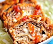 用料: 猪肉300克,鸡蛋1个,芝士片4片,面粉50克,面包糠80克,卷心菜100克,食盐1/2茶匙,甜辣酱适量,黑胡椒粉少许 做法: 1、鸡蛋打散,猪肉片待稍稍解冻后,拉直重叠平铺成上下两排,撒上