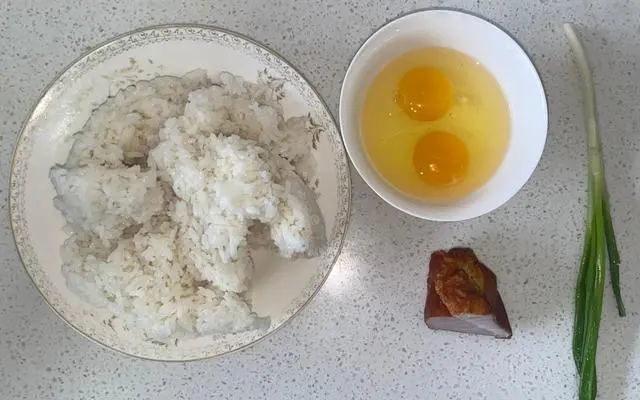 疫情突发起来,导致没有机会提前备菜,就用仅有的食材做些简单的吧,有什么用什么就做什么。 腊肉蛋炒饭 准备食材:1.隔夜的米饭 2.仅剩的两颗母鸡蛋 3.一小块腊肉 4.一根快蔫吧的小葱 注:米饭